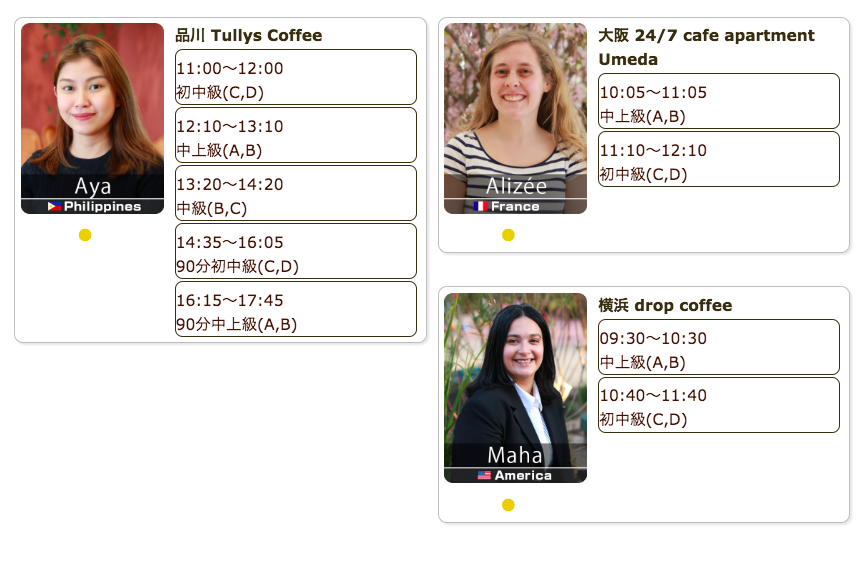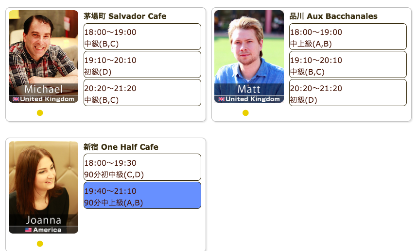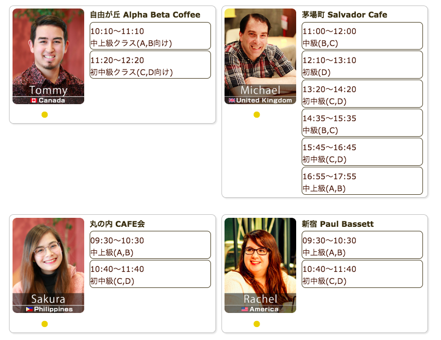 毎日仕事帰りや祝日に、駅近カフェで外国人講師による英会話レッスンを開催しています。直前予約でも参加可能、本日もご参加お待ちしています。