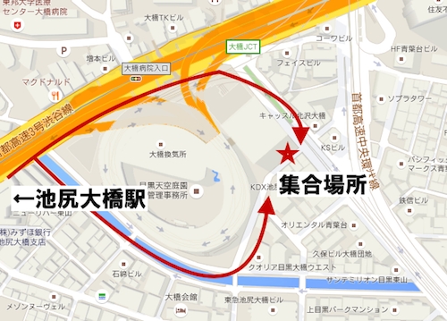 池尻大橋東口出で右に直進。LIFEというスーパーが入った高層マンションがクロスエアタワーです。