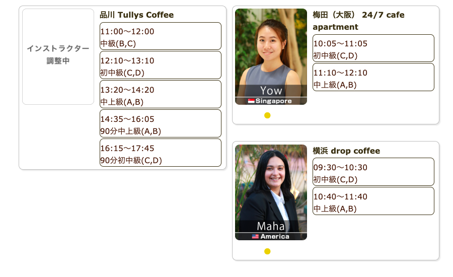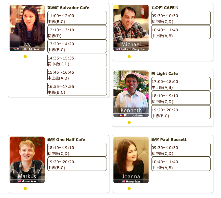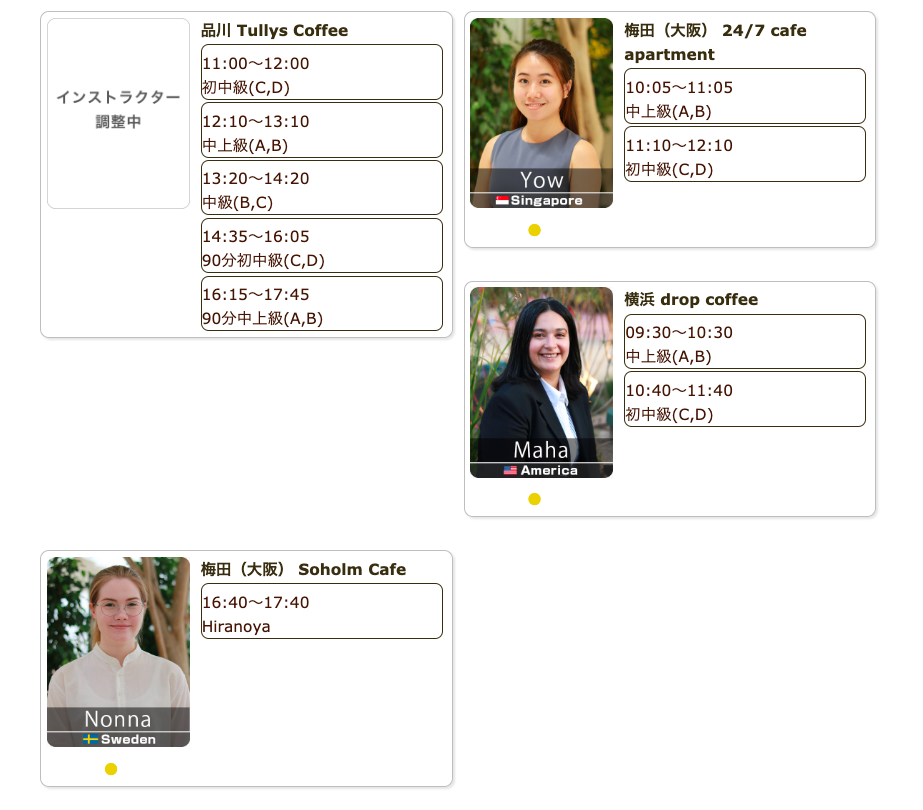 毎日仕事帰りや祝日に、駅近カフェで外国人講師による英会話レッスンを開催しています。直前予約でも参加可能、本日もご参加お待ちしています。