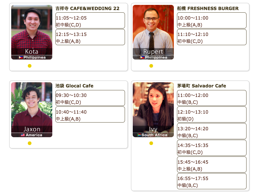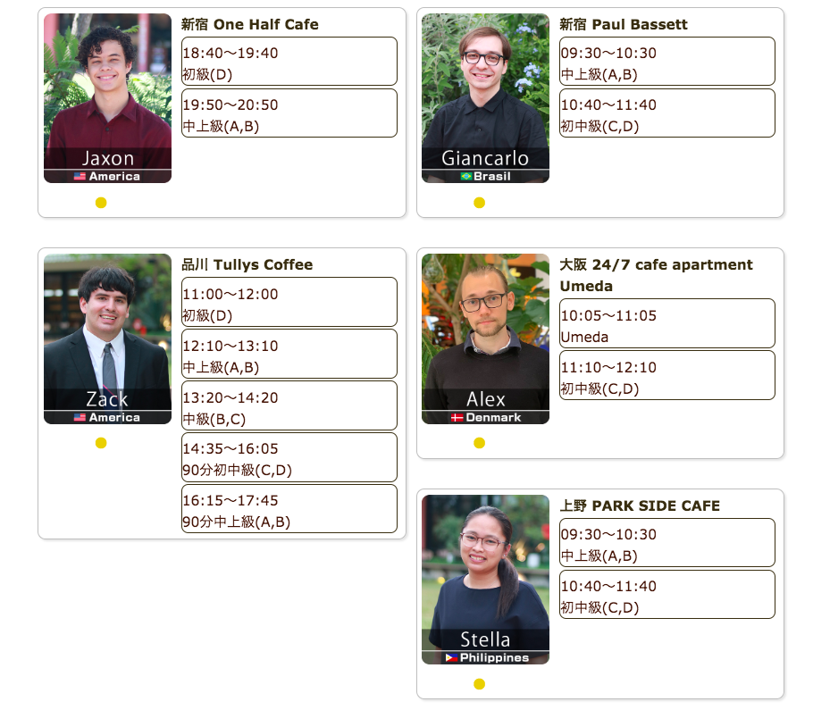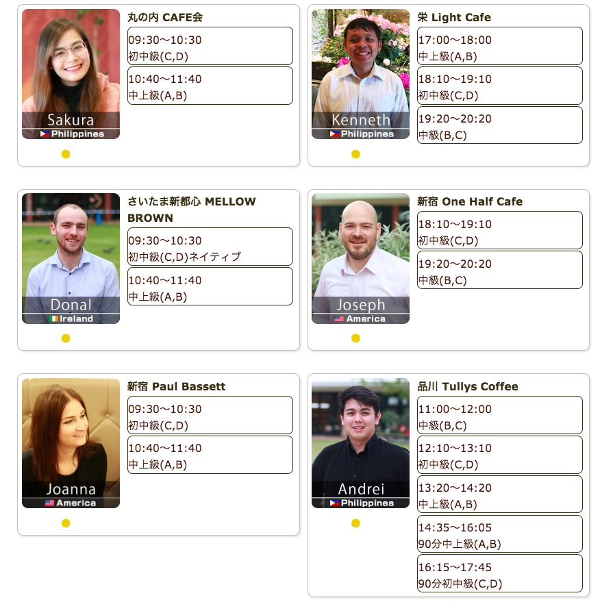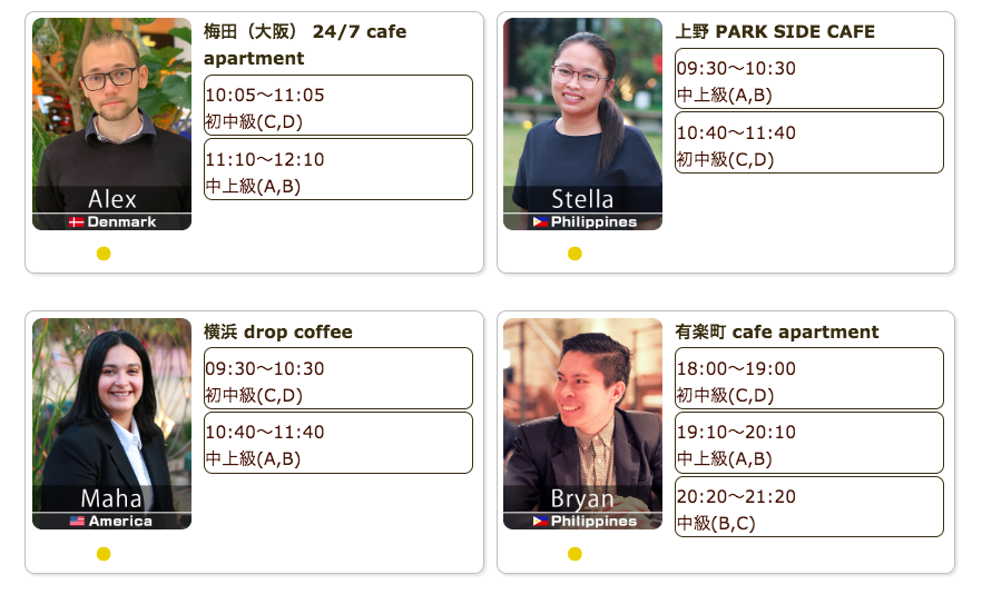 毎日仕事帰りや祝日に、駅近カフェで外国人講師による英会話レッスンを開催しています。直前予約でも参加可能、本日もご参加お待ちしています。