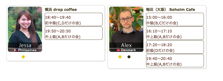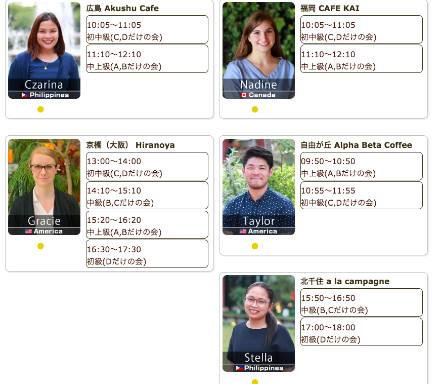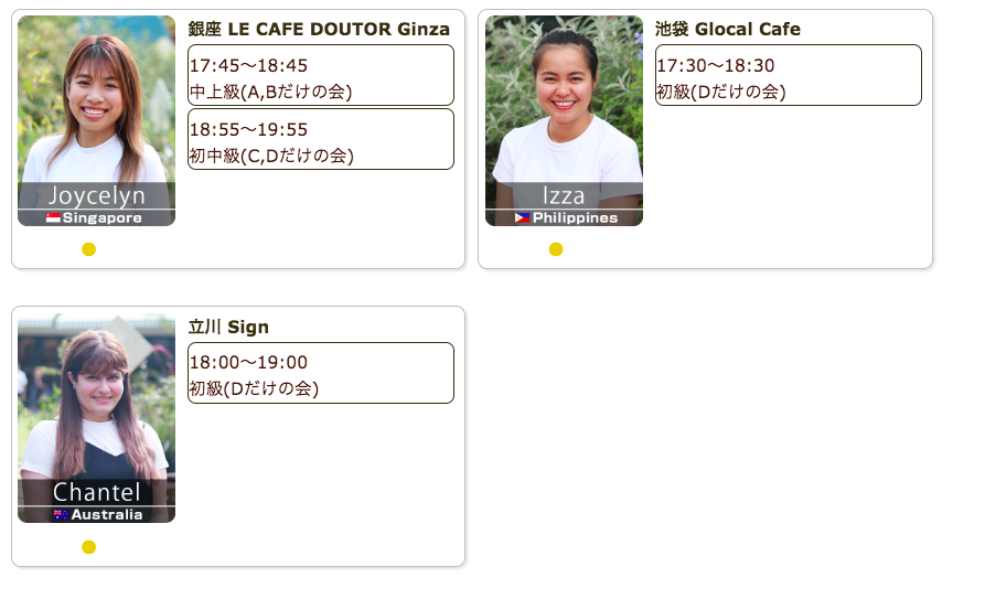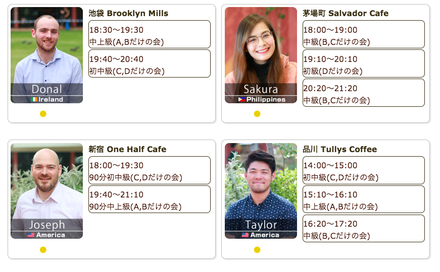 毎日仕事帰りや祝日に、駅近カフェで外国人講師による英会話レッスンを開催しています。直前予約でも参加可能、本日もご参加お待ちしています。