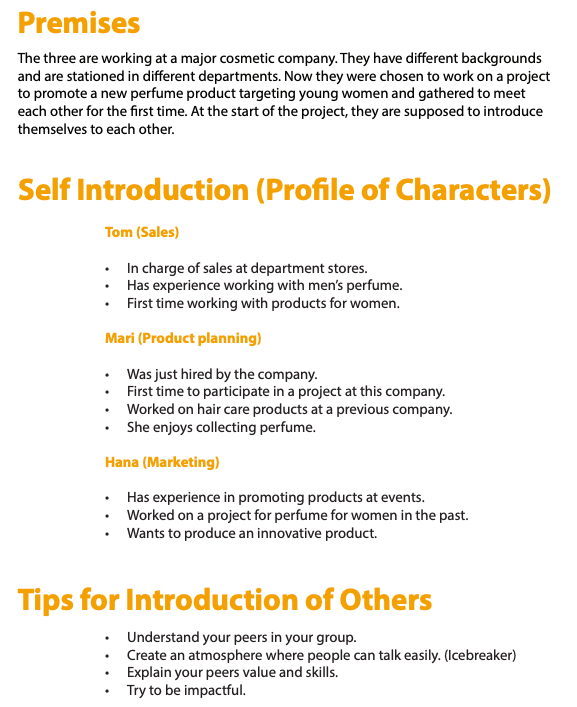 その上で、今回の自己紹介とそしてお互いの他己紹介をするメンバーの経歴を紹介します。この経歴をみて 皆様に誰かのCharacter(登場人物)になりきって、ご自分の言葉で自己紹介して見てください。(Tom, Mari, Hanaの誰か或いは、全員でも)