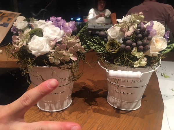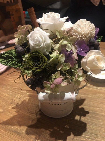 参加者さんの作品プリザーブドフラワーとは、生のお花を特殊加工して色抜き・染色・乾燥させたもの。